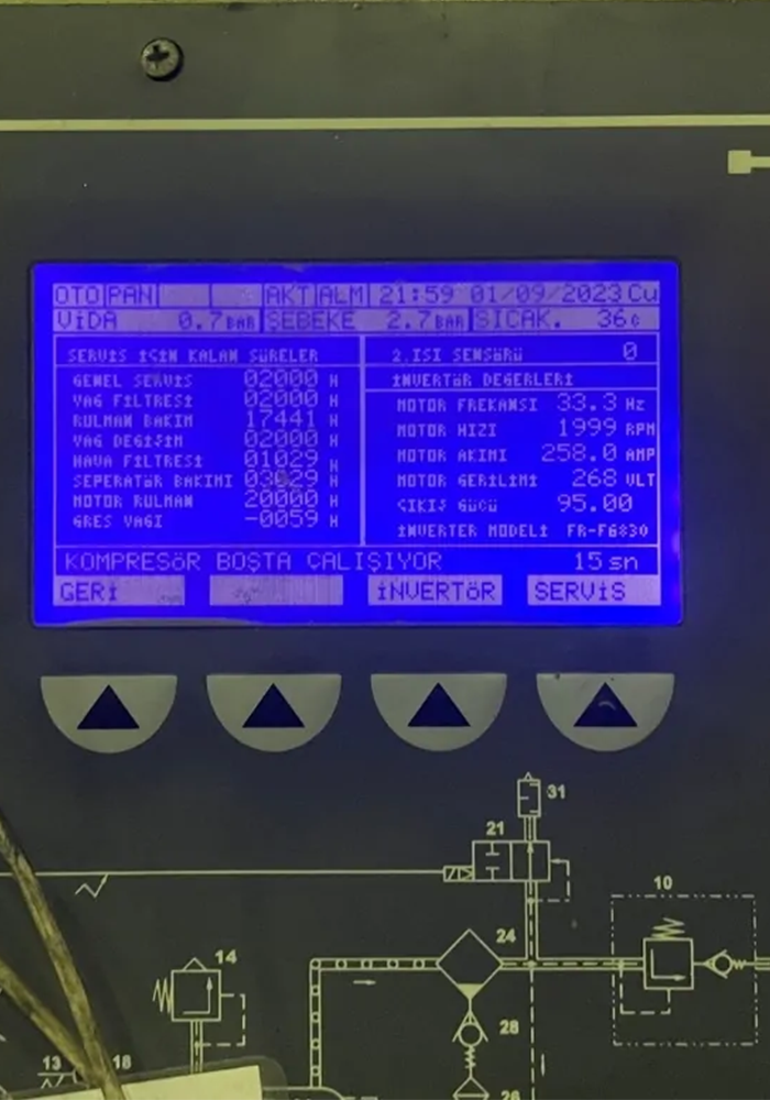 Təmir mərhələsindən sonra invertorun proqram təminatı yenidən qurulmuş və kompressor sisteminin iş rejiminə uyğun parametrlər optimallaşdırılmışdır. Yükləmə ardıcıllığı, qoruma mexanizmləri və təhlükəsizlik parametrləri yenilənmiş, enerji effektivliyi artırılmışdır.